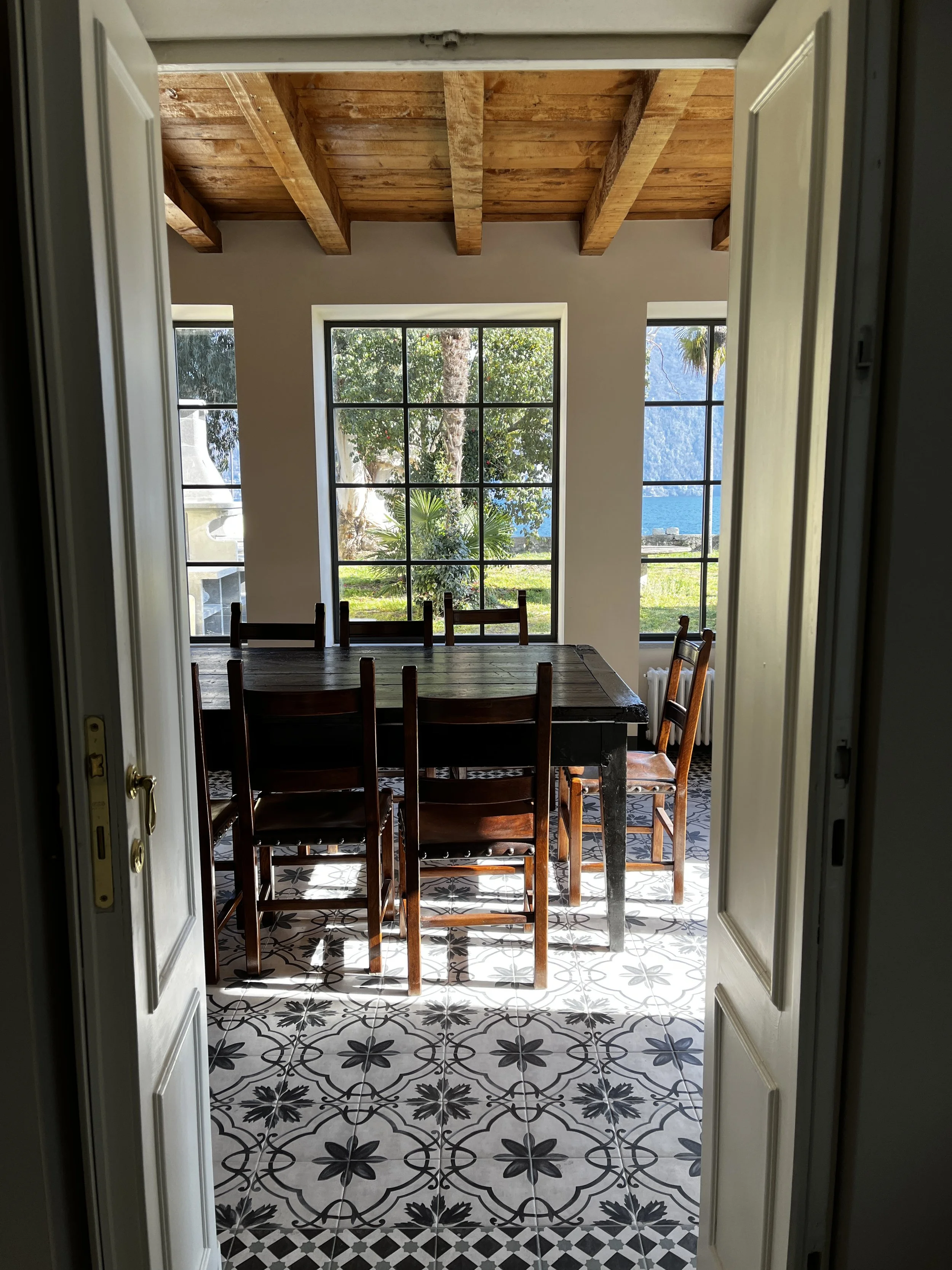 Ristrutturazione integrale di una villa con affaccio sul lago Maggiore, darsena e giardino di pertinenza realizzato a strapiombo sul lago nell’800. La villa viene frazionata in due appartamenti differenti con spazi ricreativi in condivisione al piano terra ed al primo piano. Al momento dell’inizio del progetto la villa era in totale abbandono con parti strutturali danneggiate. Il progetto cerca di seguire la corrente di pensiero della conservazione delle finiture originali. Ove possibile vengono mantenuti i pavimenti originali, mentre le pavimentazioni a piastrella vengono scelte in armonia con il sapore antico. Le porte vengono conservate le originali ove possibile e le nuove finestre in legno seguono le stile delle porte. Per le pareti vengono usati colori in calce ed alcuni ambienti vengono decorati a mano per dare un tocco di eleganza. Per le decorazioni sono state scelte due diverse strade: la prima più di rappresentanza tenendo i disegni originali simmetrici e lineari con alcuni motivi decorativi che si ritrovano anche in facciata, mentre la seconda segue una linea più romantica e cerca di legarsi alla natura che circonda la villa. La facciata viene totalmente restaurata preservando il graffito originale del piano nobile. Viene restaurata anche la serra originaria dell’800 nel giardino e la Darsena. Tutto il muro perimetrale era gravemente danneggiato e dissestato, anche quest’ultimo è stato messo in sicurezza con la realizzazione di un frangiflutti esterno e un contrafforte interno con una attenta canalizzazione delle acque piovane raccolte dal giardino. All’esterno viene totalmente ricostruito il muro di contenimento del giardino in maniera da renderlo fruibile per svariati utilizzi.